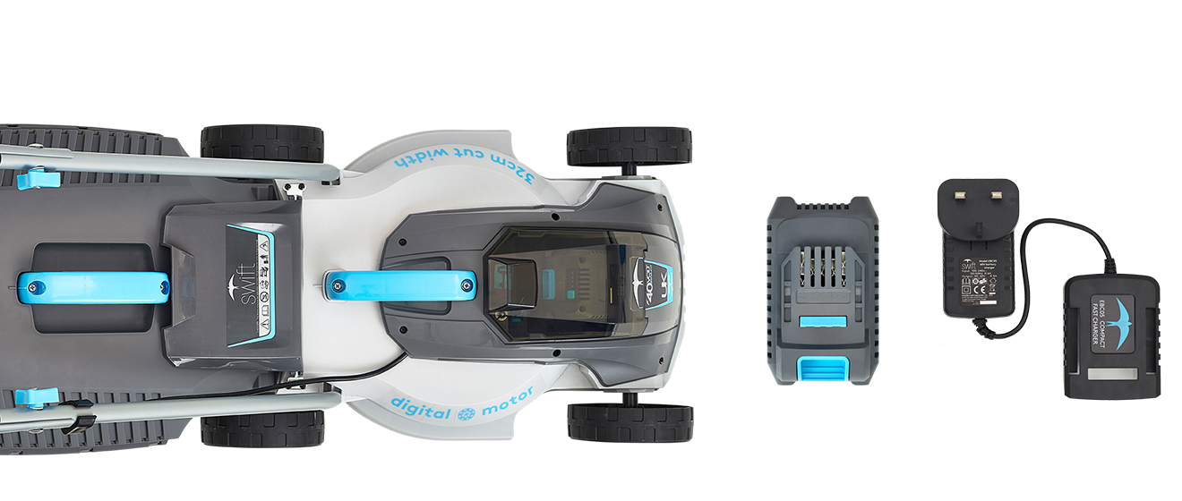 Swift Garden cordless battery electric powered garden tools. Including a full range of interchangeable 40v tools which include mowers, chainsaw, grass & weed trimmer, leaf & debris blower, hedge trimmer, polesaw & log reach hedge trimmer.